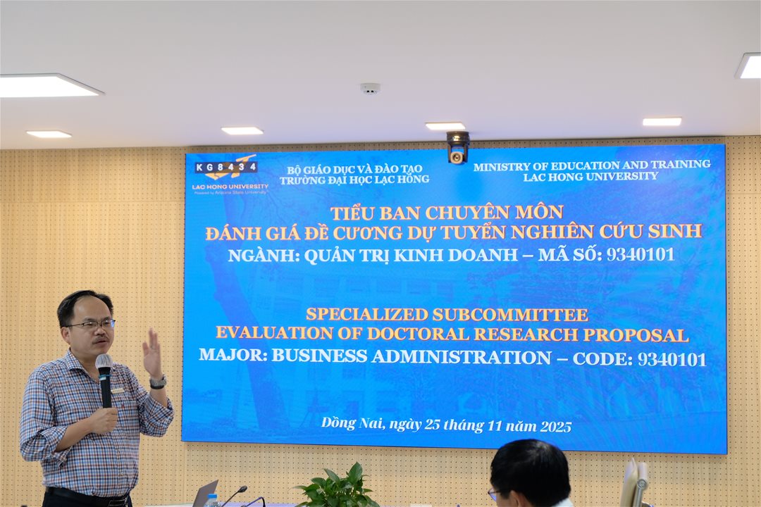 Ngày 25/11/2025 tại phòng họp cơ sở 1 Trường Đại học Lạc Hồng, Khoa Sau đại học đã tổ chức Tiểu ban chuyên môn đánh giá đề cương dự tuyển tiến sĩ ngành Quản trị kinh doanh năm 2025 - Đợt 4.