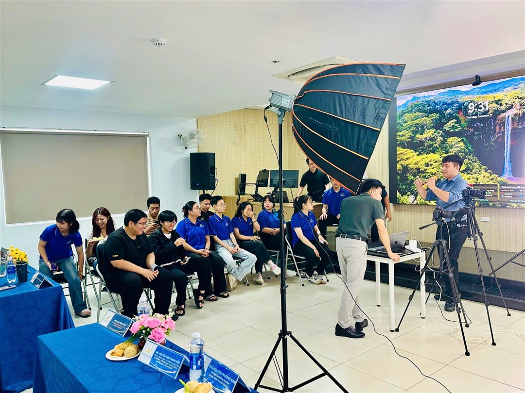 Điểm nhấn nổi bật của buổi sinh hoạt là phần thực hành livestream trực tiếp. Sinh viên được chia nhóm và phân công vai trò cụ thể như người dẫn livestream, người hỗ trợ kỹ thuật và người quản lý nội dung. Hoạt động này giúp sinh viên từng bước vượt qua tâm lý e ngại khi đứng trước ống kính, rèn luyện sự tự tin, khả năng giao tiếp và xử lý tình huống linh hoạt trong quá trình lên sóng.