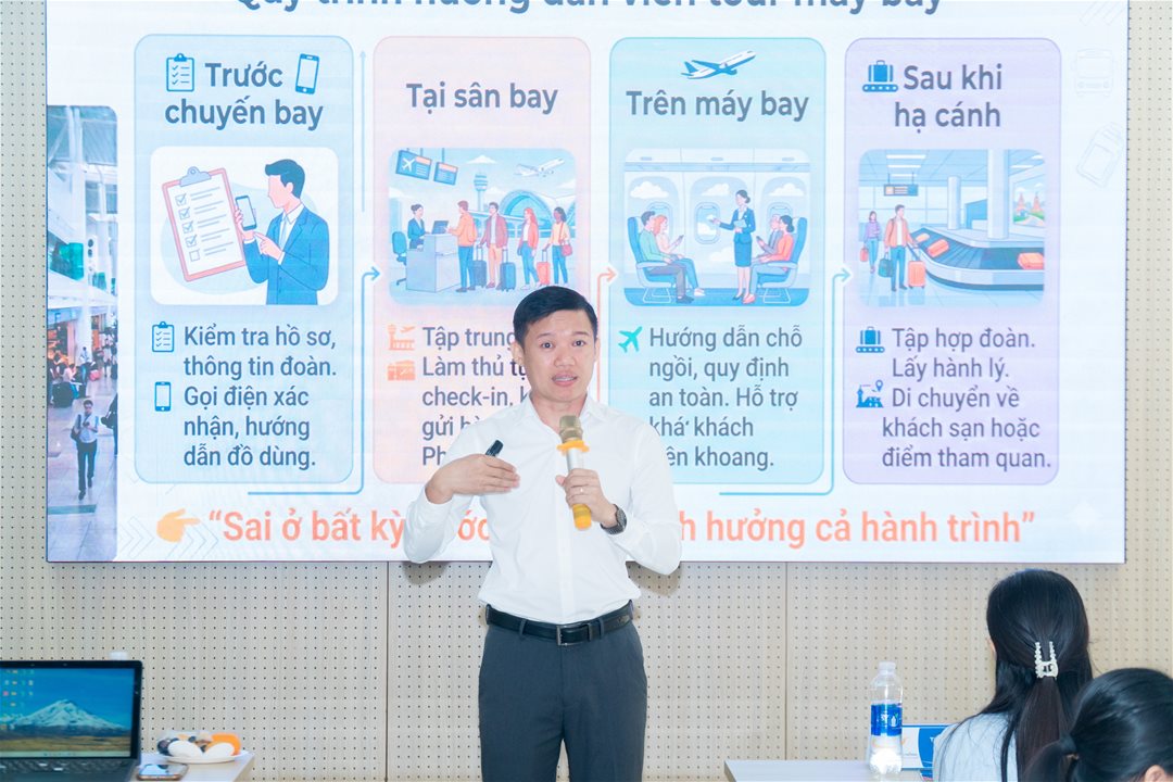 Tại chương trình, ThS. Phạm Văn Thành – Phó Giám đốc Công ty Du lịch Quốc tế Bốn Mùa đã mang đến những chia sẻ thực tế, giúp sinh viên hiểu rõ hơn về vai trò của hướng dẫn viên trong các tour sử dụng phương tiện hàng không. Không chỉ dừng lại ở việc dẫn đoàn, hướng dẫn viên còn đảm nhận nhiều nhiệm vụ quan trọng như tổ chức đoàn, phối hợp với hãng bay, kiểm soát hành trình và xử lý các tình huống phát sinh.