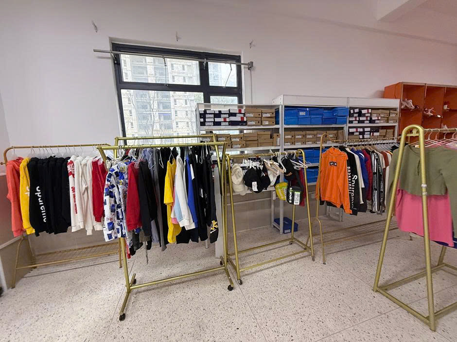 Khu vực lưu trữ và trưng bày hàng hóa thực tế (quần áo, giày dép) phục vụ trực tiếp cho các dự án livestream bán hàng của sinh viên