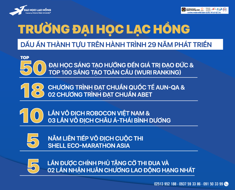 • Sinh viên Trường ĐH Lạc Hồng đã dành được nhiều thành tích trên đấu trường trong nước cũng như Quốc tế: 05 năm liền vô địch xe tiết kiệm nhiên liệu Châu Á; giải Nhì cuộc thi Khởi nghiệp Quốc gia; giải Nhất và giải Nhì cuộc đua số cụm MN; 10 lần vô địch robocon trong nước, 03 lần vô địch robocon Châu Á Thái Bình Dương và hàng loạt các giải thưởng trong nước và quốc tế khác. Đặc biệt, Đại học Lạc Hồng có 18 chương trình đạt chuẩn quốc tế AUN-QA.