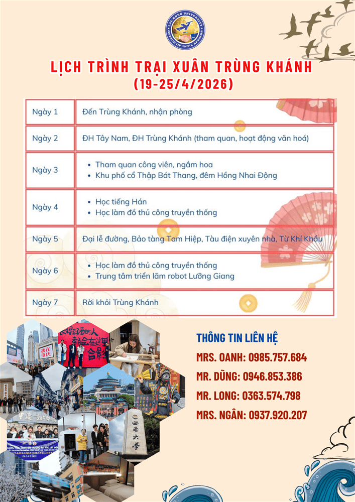 • 👉Thông tin chi tiết vui lòng liên hệ: Phòng Quan hệ Quốc tế - C104, Cơ sở 1, trường ĐH Lạc Hồng.