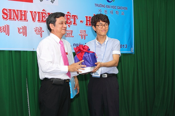Assoc. Prof. Kyoung Jin (right) on behalf of Gachon University presents a gift to Vice Rector of LHU Dr. Nguyen Van Nam.