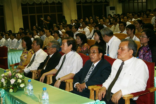 Dong Nai provincial leaders and leaders of Lac Hong University listening to the report on achievements