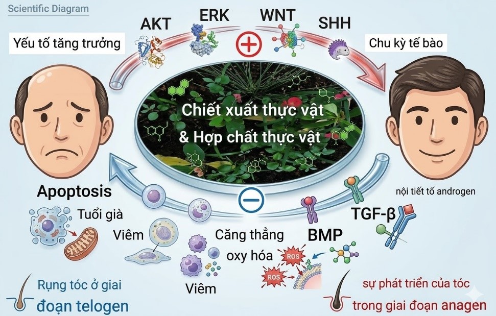 • - Kích hoạt tín hiệu mọc tóc: Kích thích các con đường truyền tin quan trọng như WNT/β-catenin, SHH và các yếu tố tăng trưởng (VEGF, IGF-1) giúp nang tóc hoạt động mạnh mẽ.